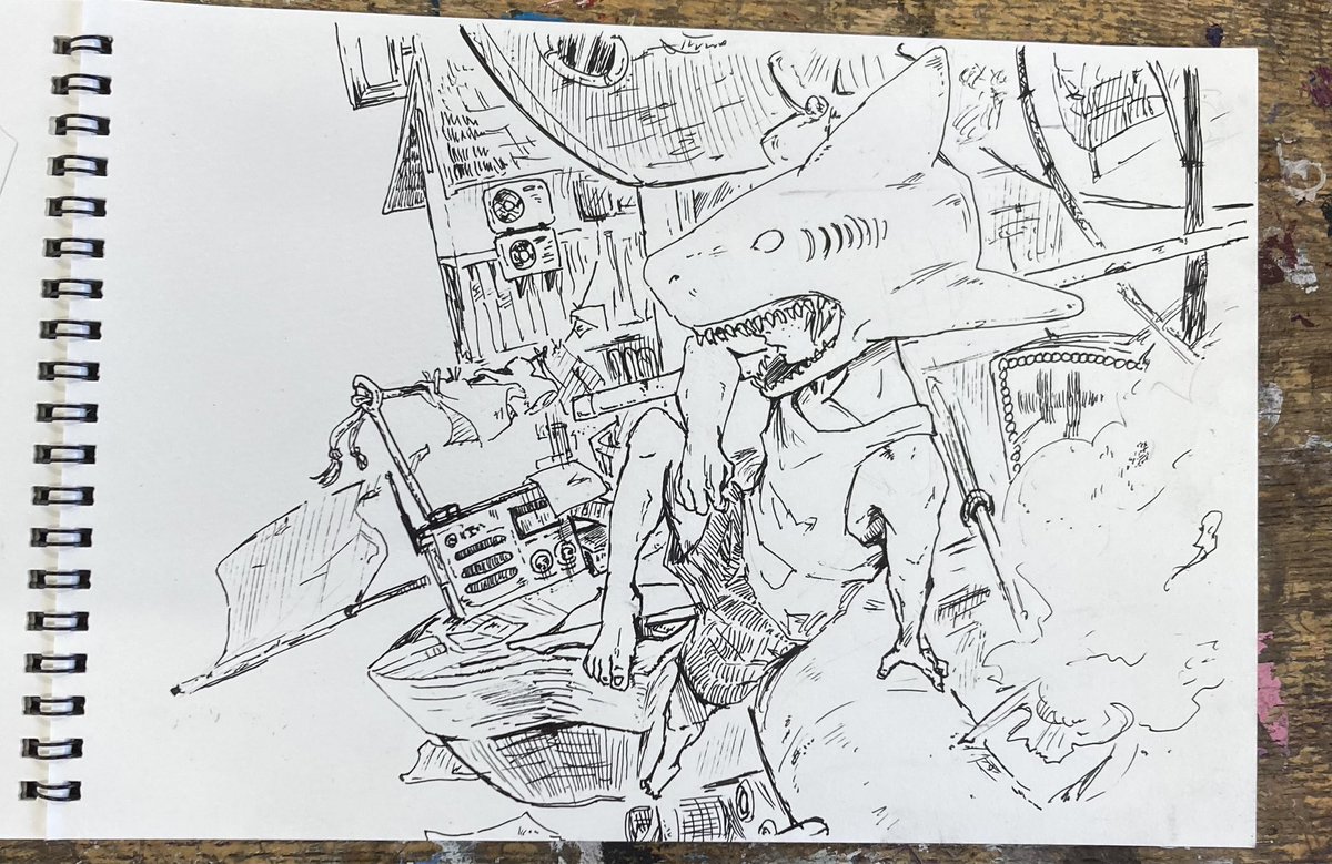 ドアから描き始めたらどんなんなるかなーと思って描いたらこんなんなった。 普通の人の勉強机がわからん…!! (万年筆の一発描き) #落書き