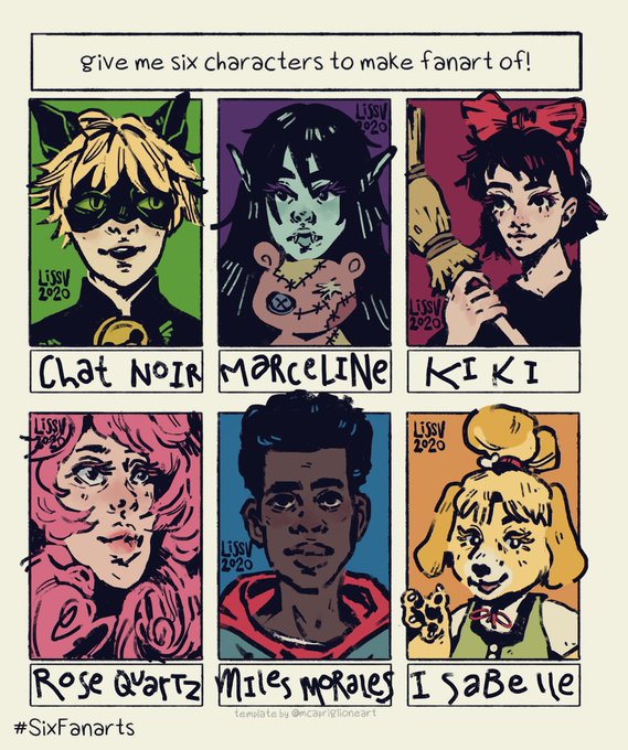 #SixFanarts challenge!! decided to pick the characters myself just for a bit of fun 😎 featuring chat noir, marceline, kiki, rose quartz, miles morales and isabelle 💕 thank you @mcapriglioneart for the epic template #SixFanartsChallenge #digitalart