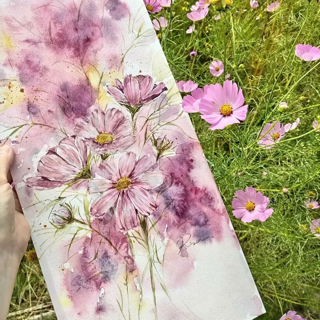 #今年も残りわずかなのでお気に入りの4枚を貼る 水彩画。 植物などを描きます🤗 今年は念願の展示会を開催できました❤️がその後はオーダー以外の絵はなかなか描けず🥹 額縁も製作しています!アンティーク調のデザインが可愛い✨のに杉材使用なので見た目より超軽いんです👏👏