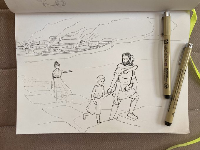 #ClassicsTober Day 1 - “Traveller” Had to go with Aeneas, given my recent Aeneid kick. Potentially regret trying to draw a whole scene within a lunch break, resulting in hands varying from “meh” to “oh lord” and everyone looking mildly bored for fleeing a burning city #inktober