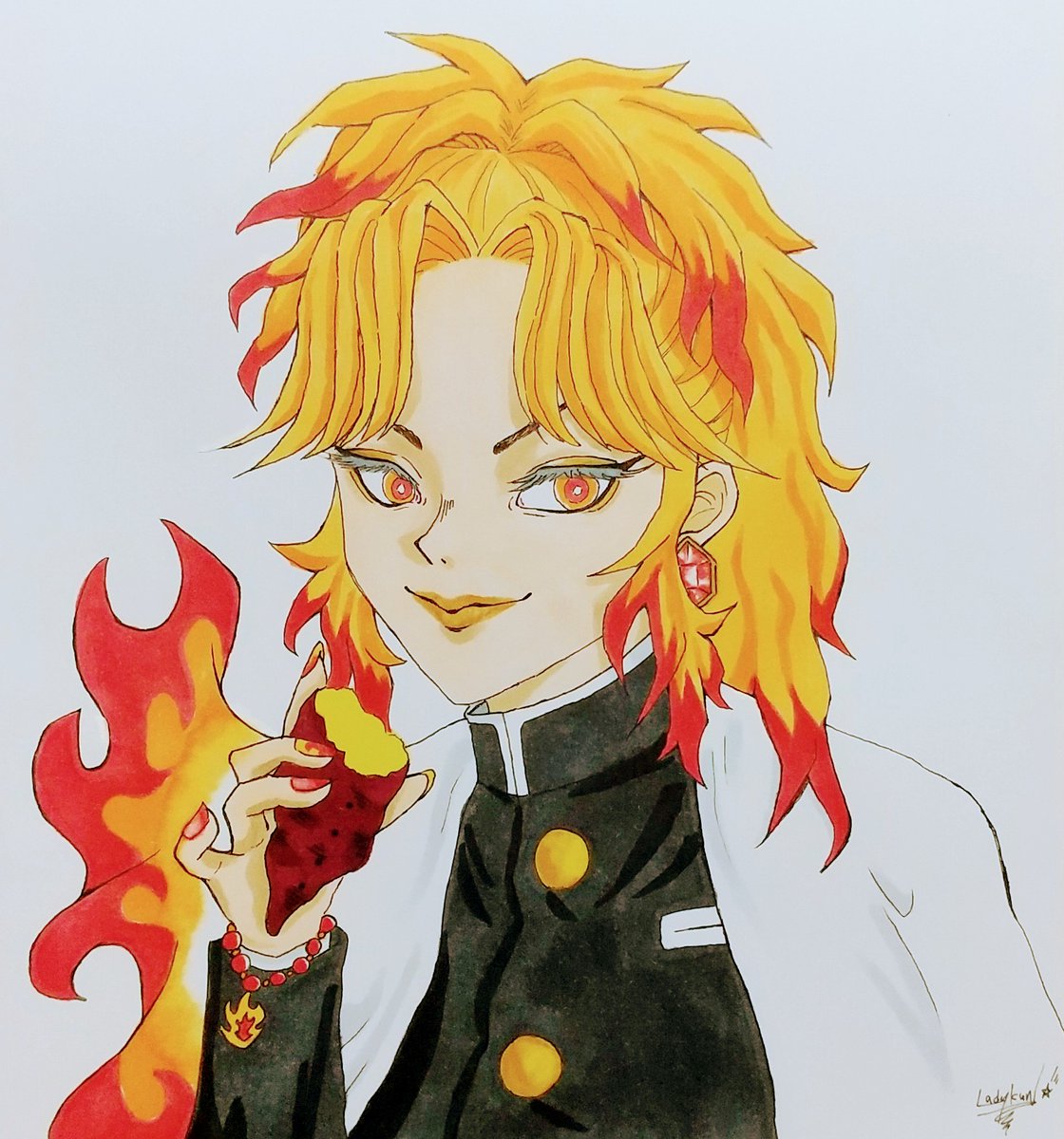 さつまいもと女版炎柱🔥 ファッションポイント 画像②ネイル&アクセサリー 画像③ヘアスタイル 画像④耳飾り #イラスト好きな人と繋がりたい #イラストレーターさんと繋がりたい #コピック #illustration #さつまいもの日 #鬼滅の刃 #炎柱