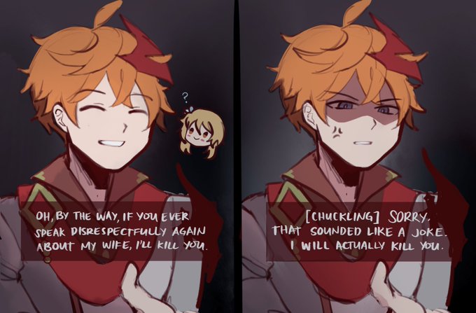 after all this discourse.......... childe just wanted to see lumine make a cute face... all for him, ehehehe- i hate u sir (she's gonna kill him later) #genshinimpact #chilumi
