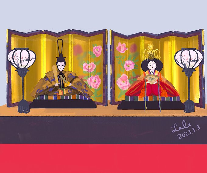 3 27 地域イベントの雛飾りを見に行ったのですが、7段飾りが10以上並んでいて見応えがありました。写真の一部を模写したものです。金屏風描くのが楽しかった! #ひな祭り #イラスト 23/03/04 00:26