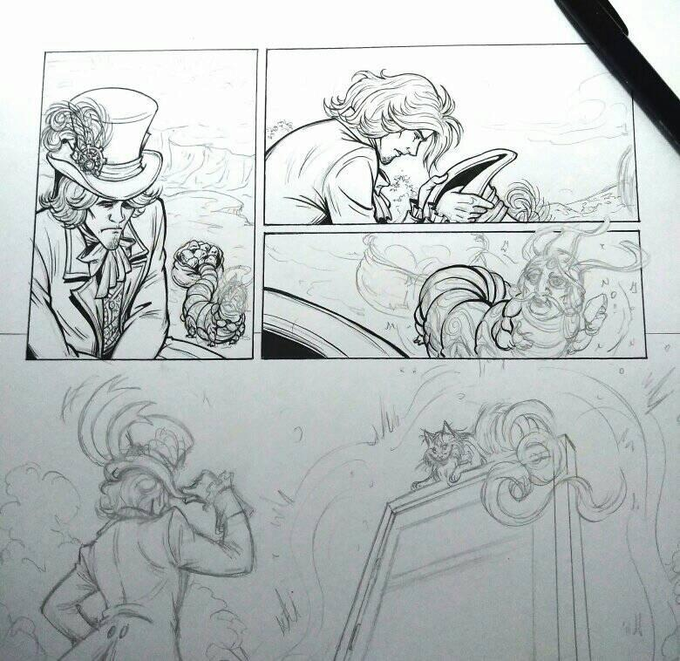 Inking page 2! Less details and backgrounds, but still challenging 😬 #AliceInWonderland #madhatter #cheshirecat #absolem #workinprogress #comics #comicbooks #inktober2020 #inking