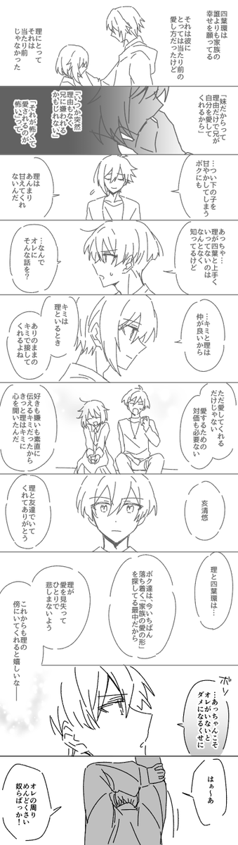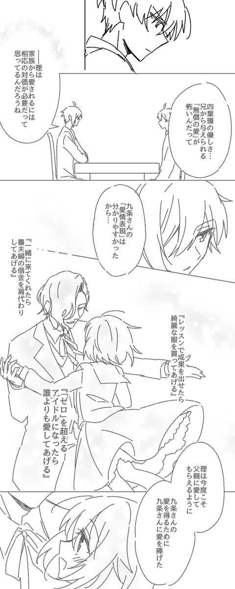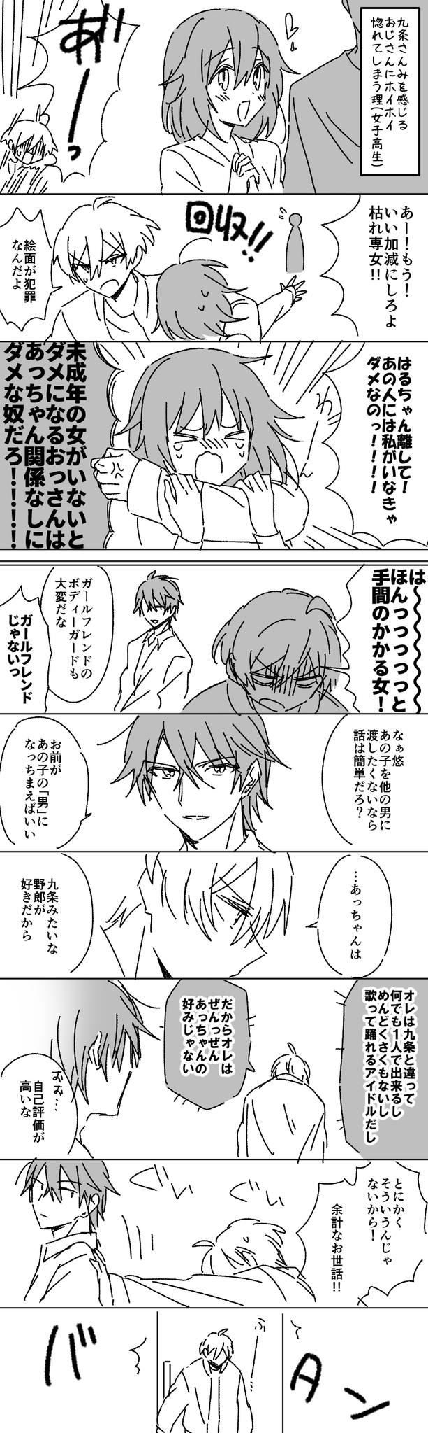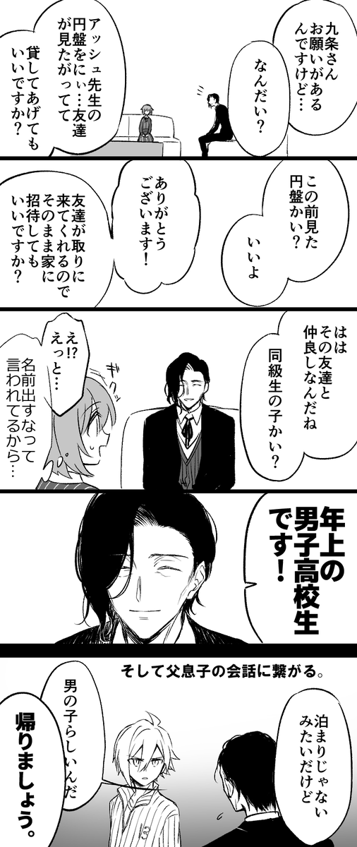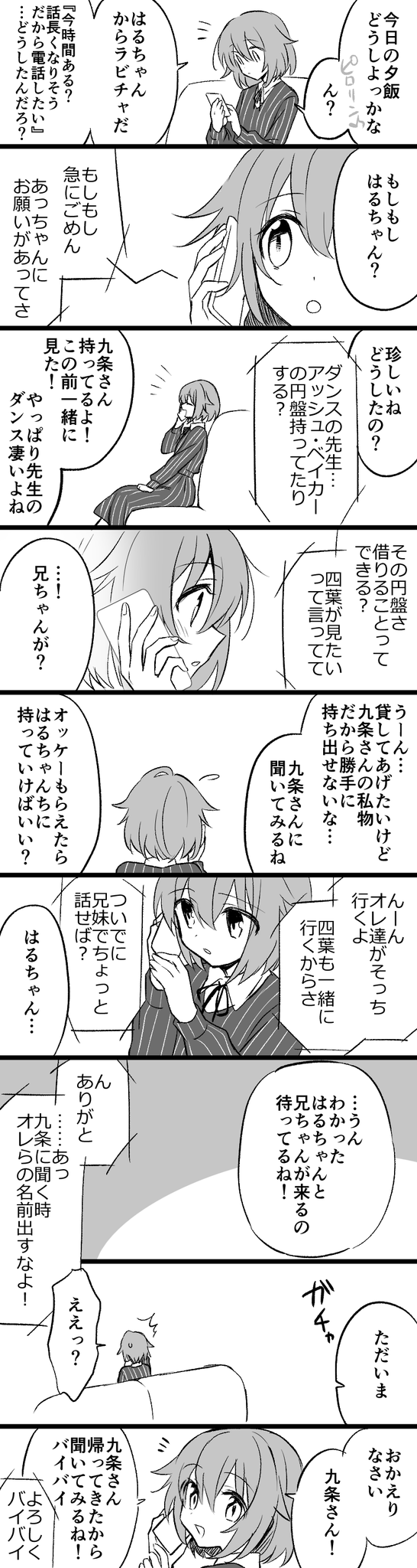 第5部14章あたりの九条家妄想 悠と理ちゃんの電話を盗み聞きしてソワソワするズールのお兄さん達が可愛かったので、九条家も理ちゃんの発言でハラハラしててほしい