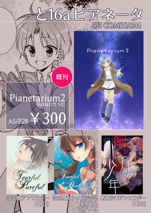 遅くなりましたが明日のCOMITIA144お品書きこちらになります! 目新しいものはないんですが間に合えば漫画ペーパーもっていきたい 今のところ半々です(…) 【と16a】におりますのでよろしくお願いします~~!! #COMITIA144
