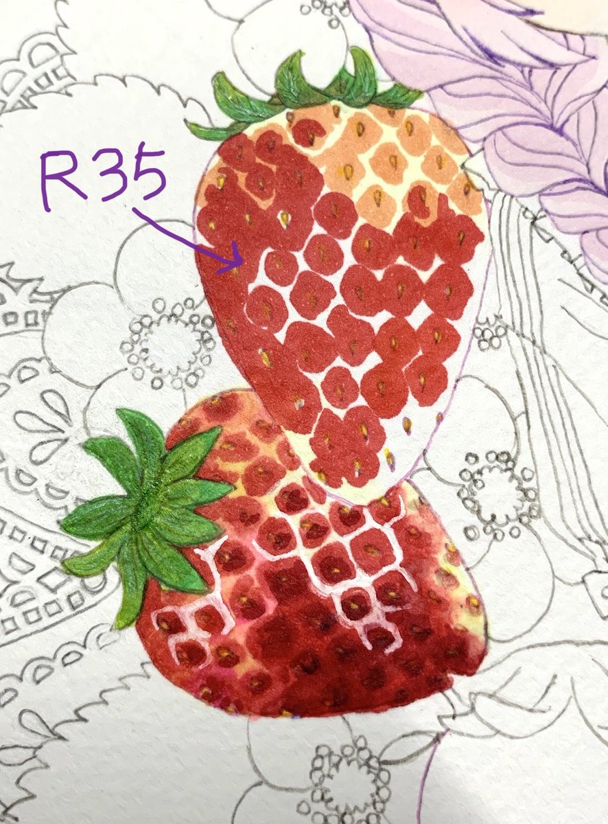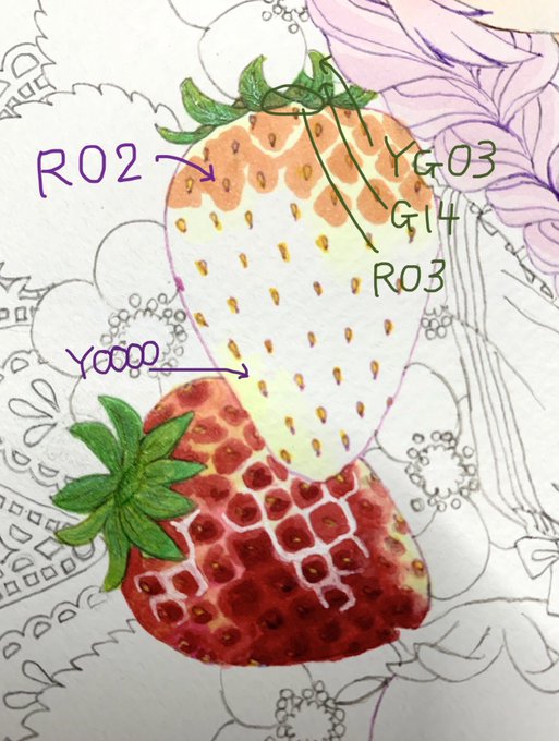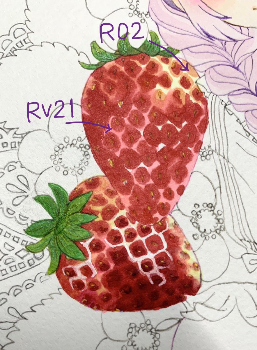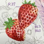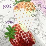 6 16 🍓いちごの塗り方🍓 ①明るい部分にY0000を塗り、種を囲うようにR02を塗る。 ②ベースとなるR35を光の当たる部分を避けて塗る。 ③白抜き部分にRV21を塗る。 ④色がくっきり分かれているのを馴染ませ整え、濃い影にRV37を塗る。所々B60とB63も使用。 ホワイトを入れて完成! #コピック 22/05/09 23:07