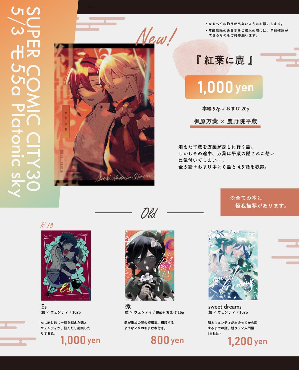 【5/3新刊】万平本サンプル+お品書き | 瑠璃坂◇5/3 モ55a pixiv.net/artworks/10722… 5/3スパコミで頒布する🍁🦌本のサンプルとお品書きです!消えた🦌を🍁が探しに行く話です。暗めですが誰も死にません。本編92p+おまけ本20pです。pixivに長めのサンプルがあります~ 👹🍃の既刊も持っていきます