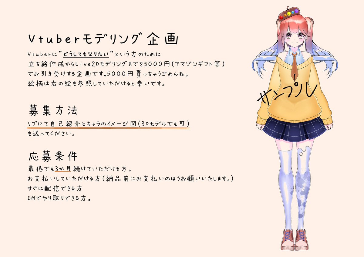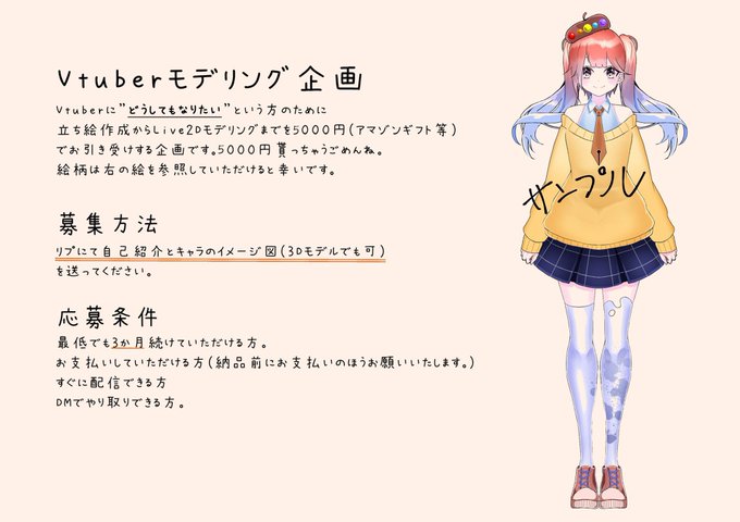 #魂募集 #Vtuberになりたい Vチューになりたいけどパパが見つからない…という方に! 分かる人には分かる、 (分からない方は相場を見てね!) “破格”でイラスト制作からモデリング作成致します! リプの中から、1〜2名選ばせて頂きます! 納期は二ヶ月以内を目安に考えてます。 ツリーに続く