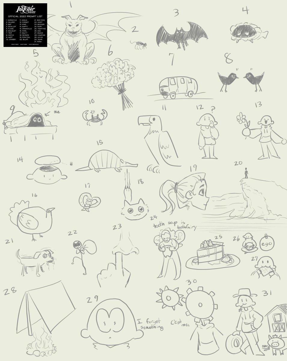 so I decided to do all the inktober prompts in one sitting, and here's what I came up with! some of them are in fact me. #inktober2022