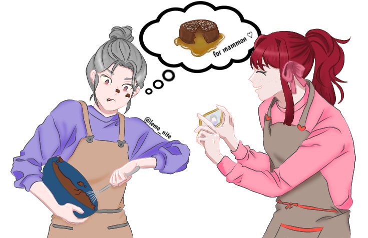 baking with Milly, @BeyB_Tornatore ✨️ we making lava cake with caramel filling that's look like gold to share with Mammon ❤️💕 //making two version cause I can't decide which hairstyle to do hehe// #obeyme #obeymemc #obeymefanart