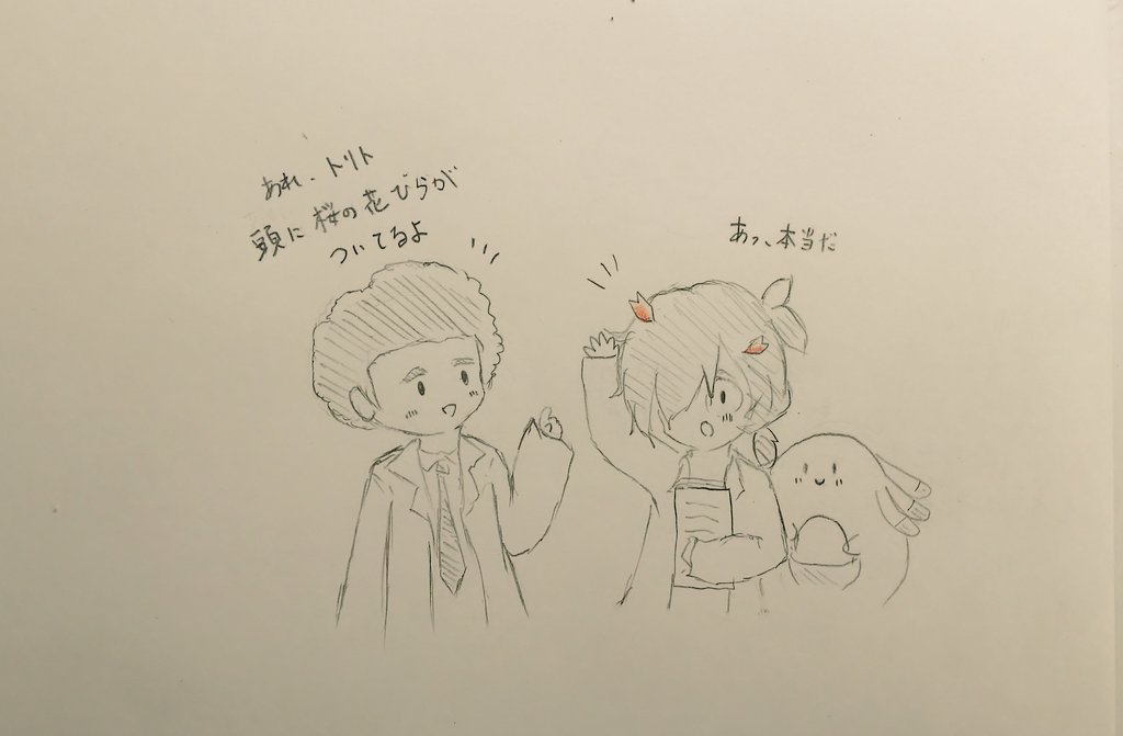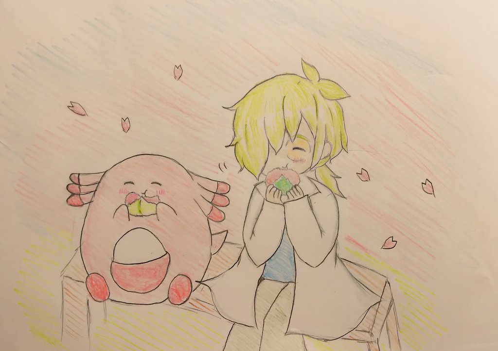 この間、桜餅を見たらふと トリト先生は桜が似合いそうだなぁ〜って思って 桜餅を食べながらお花見するトリト先生とラッキーを描いてみた🌸 2枚目はおまけだよ🌱