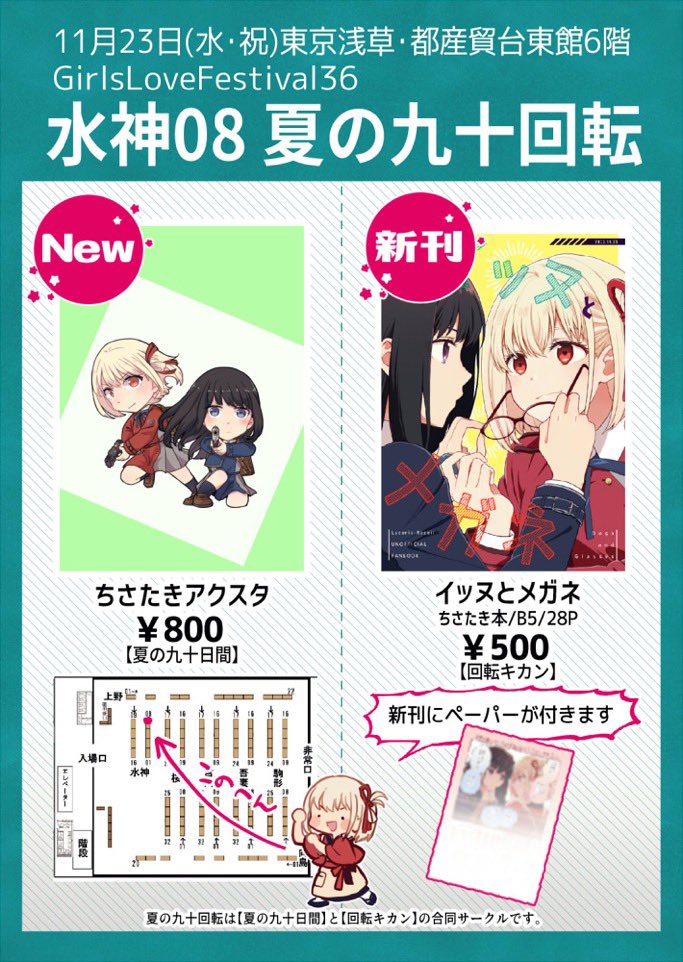 58 236 11月23日(水・祝)東京浅草・都立産業貿易センター台東館にて開催される「ラブフェス2022・11」内リコリコオンリー 「リリリ」に回転キカンさん(@rt_enpt)と合同サークルで参加します!夏の九十回転です。間に合えば健全ちさたき本出ます。もう逃げられません。\タスケテ/ #GLFes #LRL1st 22/10/05 22:11