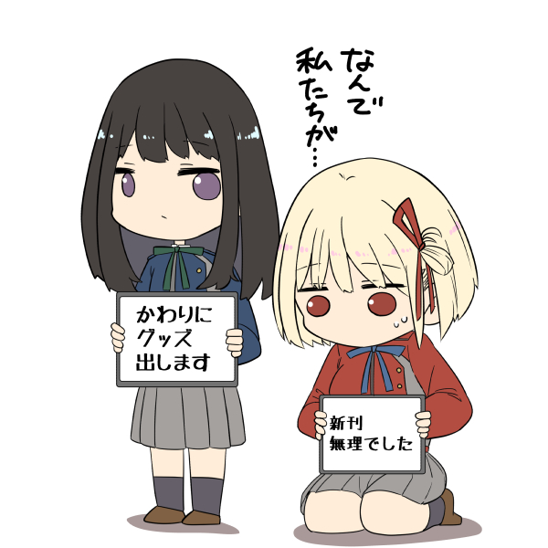 11/23(水・祝)GLFes内リコリコオンリー【水神08】のお品書きになります。 りたさん(@rt_enpt)は新刊と特典ペーパー。れおなるどはアクスタを頒布します。 りたさんの特典ペーパーは数に限りがございますのでご了承ください。 #LRL1st #GLFes