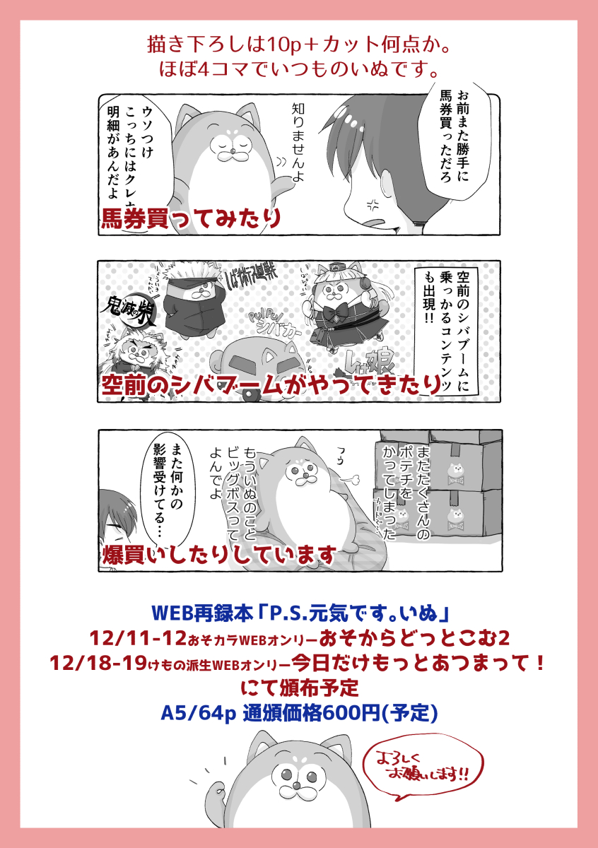 [部数アンケ&サンプル]P.S.元気です。いぬ[WEB再録本] | おち pixiv.net/artworks/94217… 来月のWEBオンリーで発行するいぬ再録本です。部数アンケにご協力いただけると嬉しいです。支部にはもうちょっとサンプルあります~!