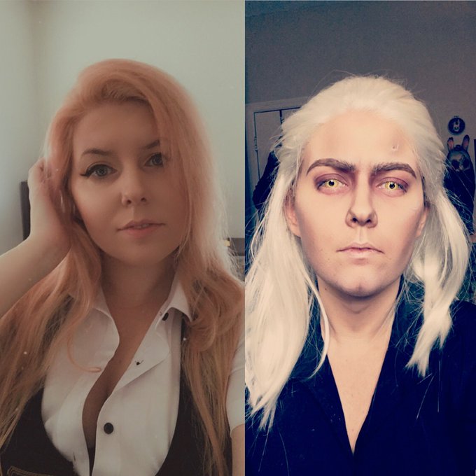 My Witcher costest with makeup courtesy of the talented @justcuriousfx ! I’ve never worn contacts before and she was patient enough to manhandle them into my eyes. Plus side by side to appreciate the transformation . #thewitcher #TheWitcherNetflix #geraltofrivia #cosplay