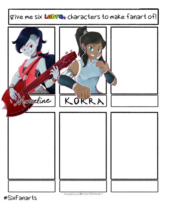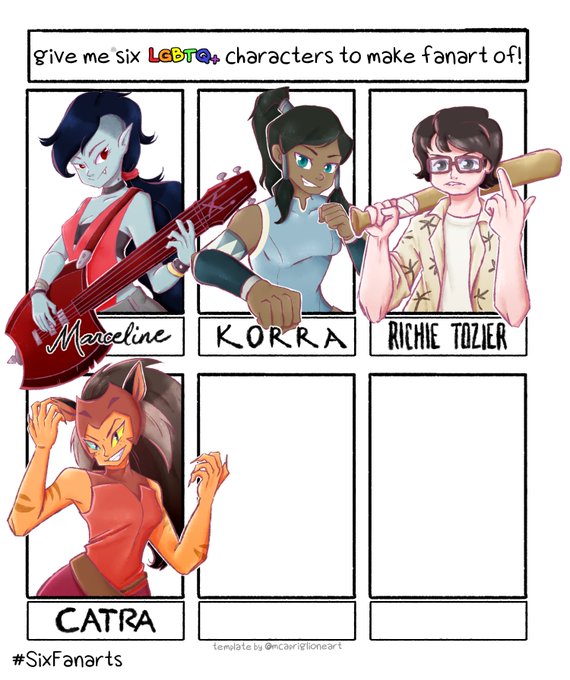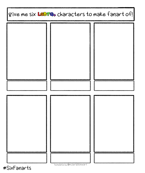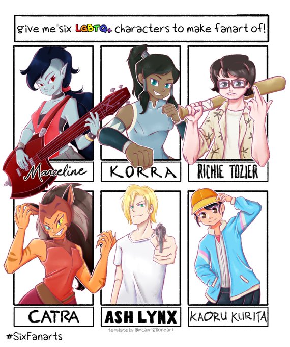 So I did #sixfanartschallenge last year so I thought of doing it again BUT FOR LGBTQ+ CHARACTERS Comment down below characters that are CANONICALLY LGBTQ+ community. No fanons and headcanons please 😊 #sixfanarts #sixfanartchallenge #sixfanart #ArtistOnTwitter #ArtistsofSEA