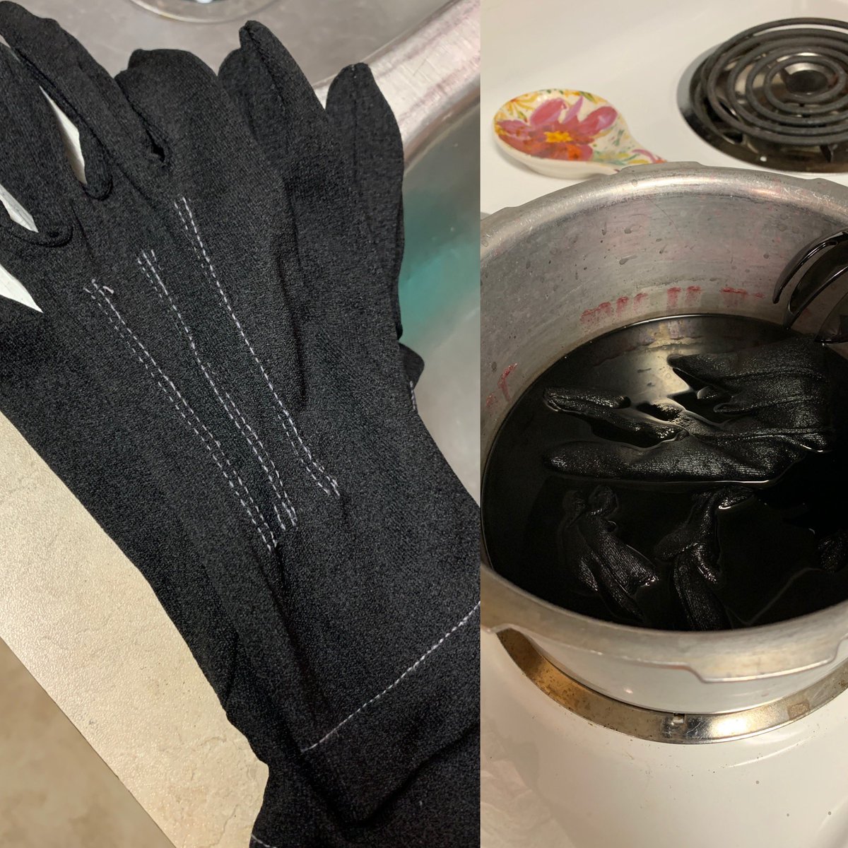 Gloves dyed and drying; shoes painted and still a WIP, and fabric being made to stripes! #eahcosplay #cosplay #cosplayprogress #maddiehatter #legacyday