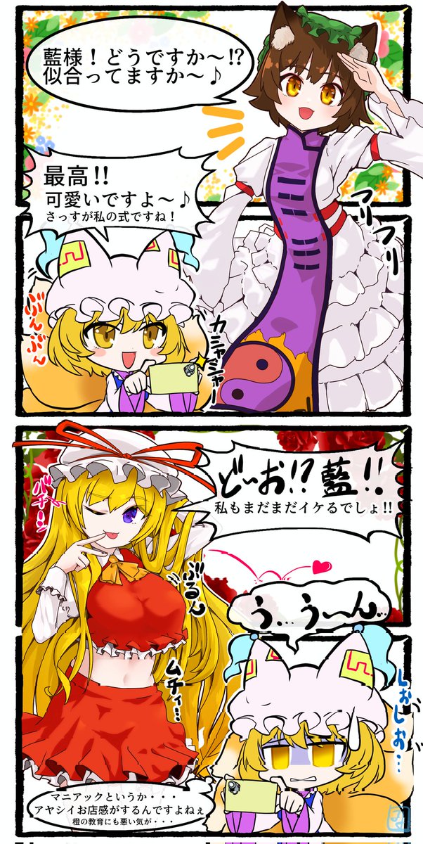 #絵描きさんと繫がりたい #東方Project #八雲紫 #八雲藍 #橙 #ハッカ油 #虫除け #絵柄が好きっていう人にフォローされたい 試してみたらびっくりするくらいコバエがいなくなったので描いてみました。