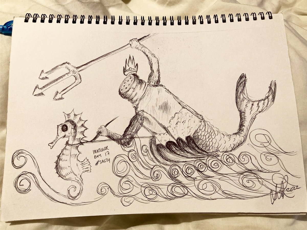 Obviously the first thing that comes to mind with todays #inktober2022 prompt (salty) is a salt shaker in a scallop chariot riding a sea horse on the waves better than any Roman Neptune could!!!! 😂😂😂