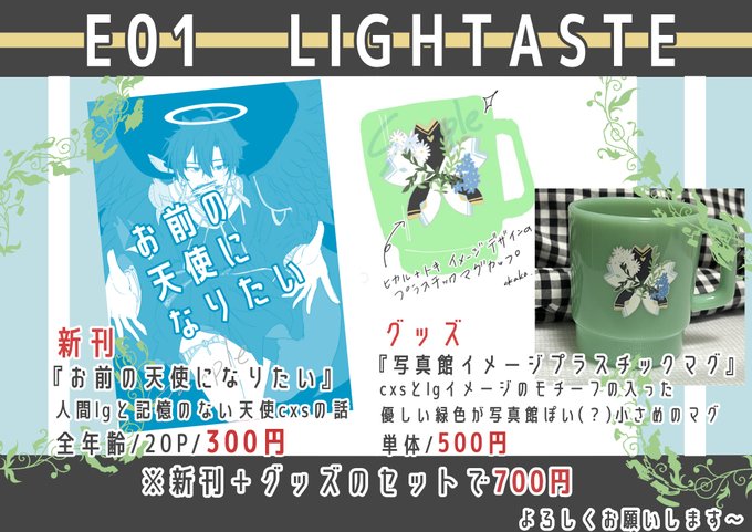 4/2開催の四辺形の世界の道筋3 【E01:LIGHTASTE】 おしながきです!マグカップは単体だと500円、本とセットで手に取ってくださった場合はセットで700円(マグ400円)でちょっとだけお得です、よかったら是非…色味ほんと可愛いので 新刊サンプル→twitter.com/lightaste/stat…