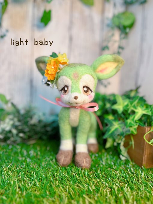 4 36 緑のバンビさん🦌🌱 ふわっとした優しい表情の癒し系バンビさん🍀 黄緑色のボディにはお花がよく似合うのでいろんな色のお花を耳に添えてみました💐 #羊毛フェルト 23/04/28 18:50
