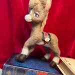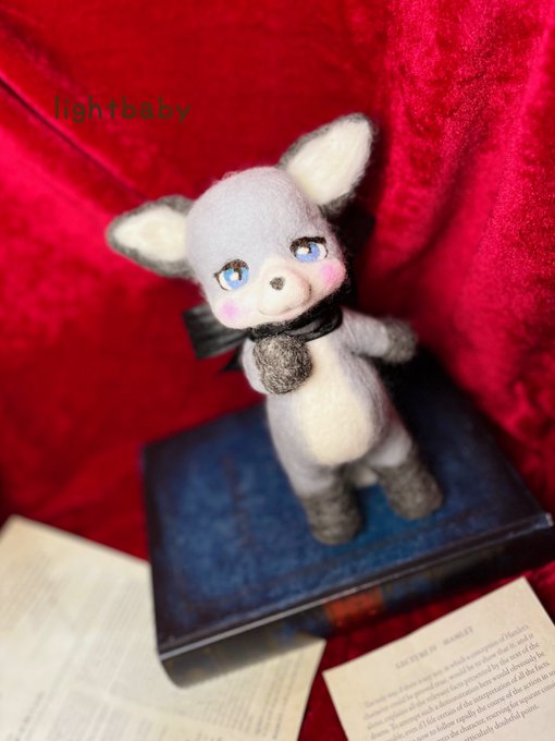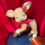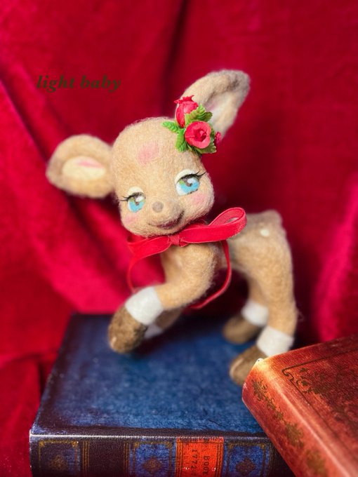 3 32 バンビさんラスト🦌🌹 キリッとしたバンビさんも作りたかったので作りました🥰 ベージュのボディにクールな瞳のバンビさんには赤がよく似合うので赤いベロアのリボンと赤いバラで上品な雰囲気にしました🌹 #羊毛フェルト 23/05/02 19:03
