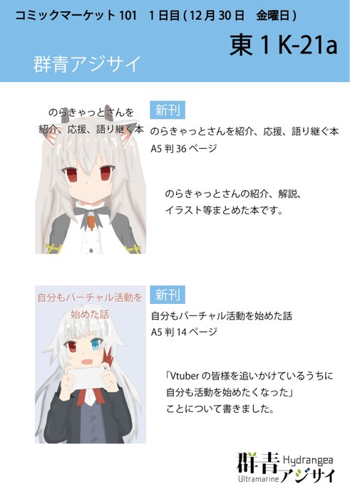 #C101 #C101お品書き お待たせしました! コミケはのらきゃっとさん本と自分の活動の本の新刊2冊で参加予定です! 【1日目 東1 K-21a】でお待ちしております! webcatalog-free.circle.ms/Circle/16804526
