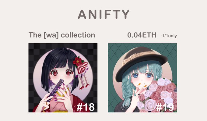13 23 🌃今夜21時〜販売🌹 「The [wa] collection」#18〜#19 各種▶︎0.04ETH💐1/1only💐 どうぞよろしくお願いします🙇♀️👘✨💐 #NFT #NFTjapan #nftart #AnimeNFT ↓メイキングあり↓ 販売はこちら▶︎ @anifty_jp (公式アカウント) 22/10/06 10:58