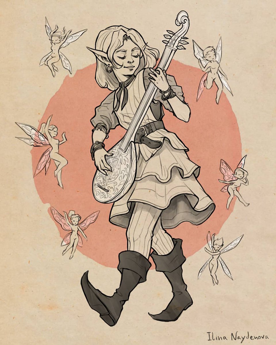 For #Inktober2019 Day 24 I drew an elf bard and some fairies dancing to the music. 🎶 I'm happy with how smoothly this drawing went. What do you think? #inktoberday24 #dndinkotber #bard #dnd #dnd5e #fantasyart