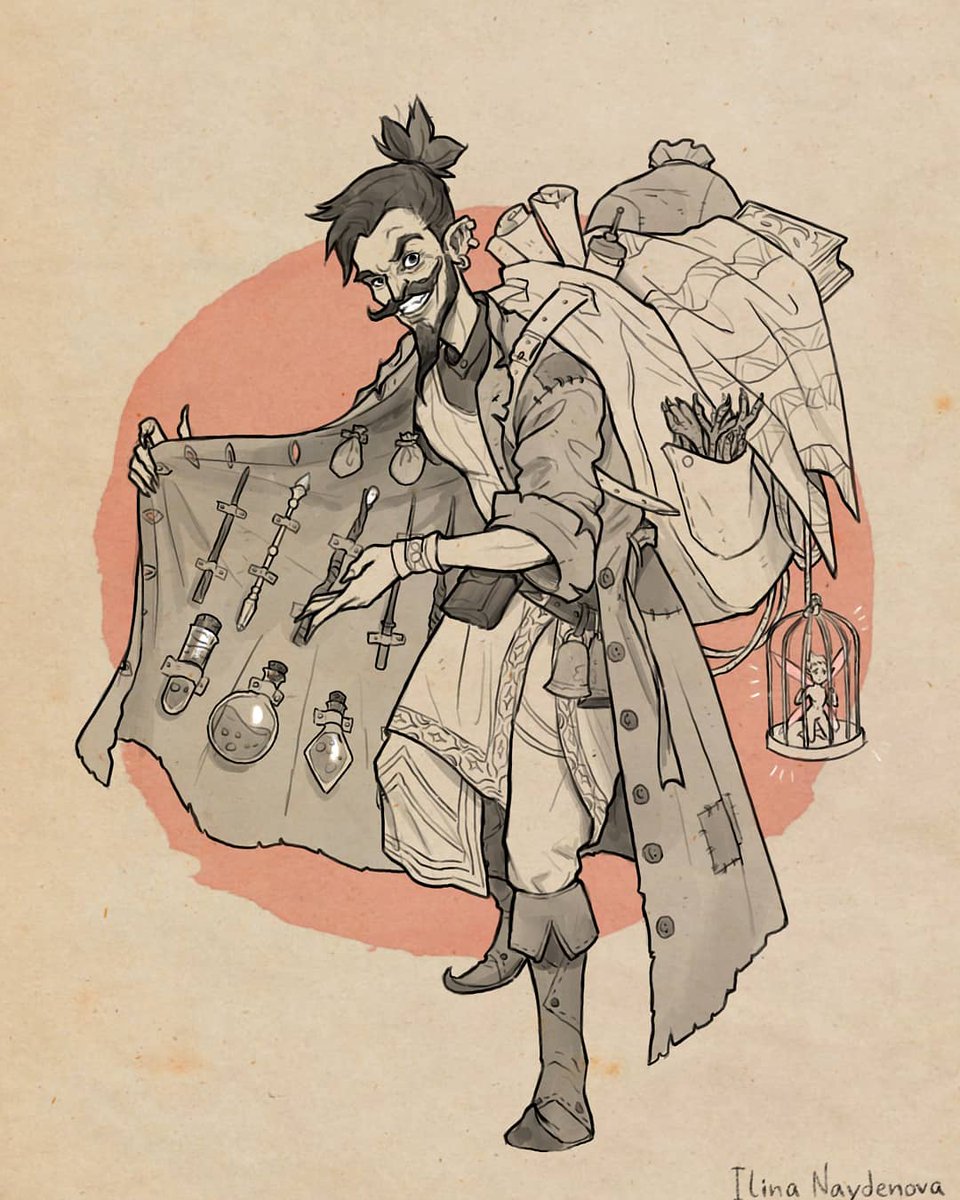 #Inktober2019 Day 25 is finished! This time we have a shady merchant trying to sell his weird items to anyone who passes by him.💰 He offers suspicious potions, wands, scrolls and even living fairies. 👀 #inktober #inktoberday25 #fantasyart #artistontwitter #dnd #dndcharacter