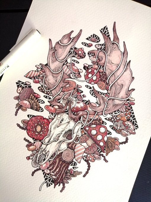 5 39 wip vintage buffalo's skull and mushrooms #イラスト #ペン画 23/06/29 21:36