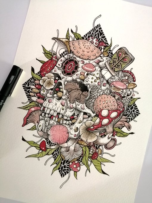 9 47 Repost 頭蓋骨とキノコ 💀🍄🌿 (original design: edited colour) #ペン画 #イラスト #watercolor #万年筆 23/06/16 22:31