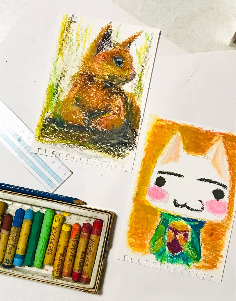 うん十年前のクレヨンで描きました。 トロは良い感じ!猫を描こうとしたら子ぎつねのように……(-ω-;)ウーン まだまだ練習します!