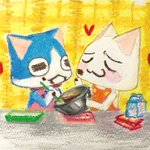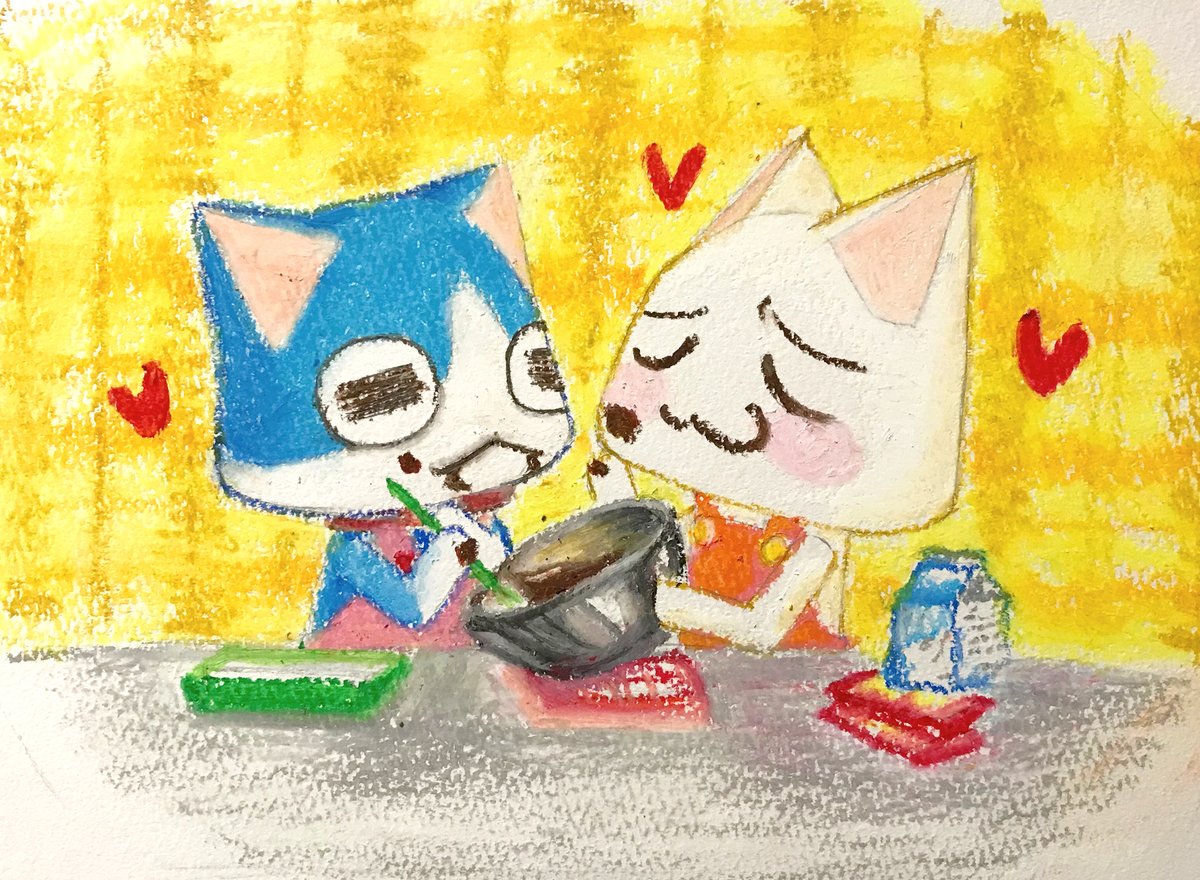 バレンタインチョコを準備中のトロとソラをクレヨンで描きました! #どこでもいっしょ #イラスト