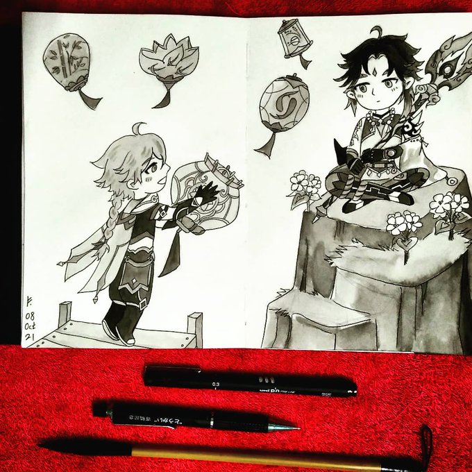 "Want one?" "Hmm." Inktober Day 8: "Xiao~ Let's go watch the floating lanterns!" #inktober2021 #inktober2021day8 #inktober2021watch #GenshinImpact #genshinimpactfanart #原神 #Aether #Xiao #sketch #penandink