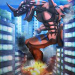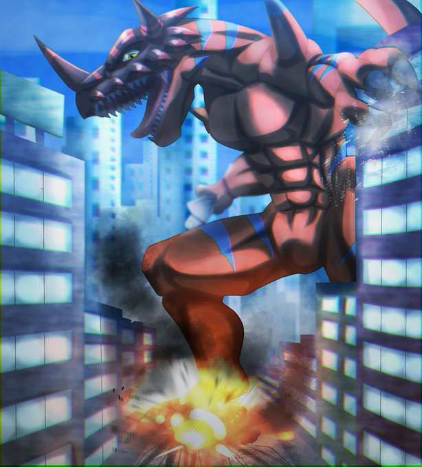 ジオグレイモン Geo Greymon こちら依頼の作品です。 依頼内容 「都心に出現した巨大なジオグレイモン」 #デジモン #イラスト