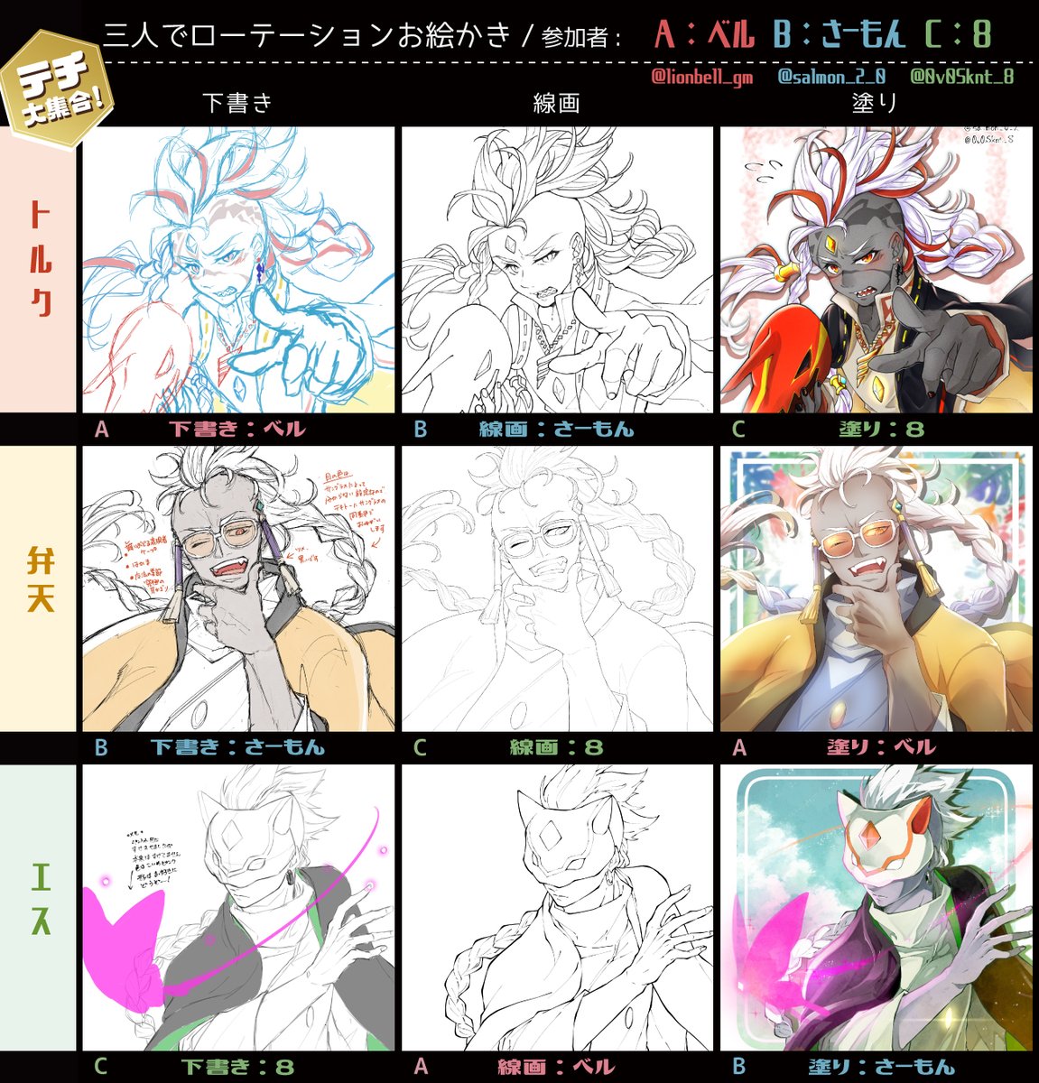 #3人でローテーションお絵描き さーもんさんと8さんとやりました!🙌テチ大集合✨ ウチが最後着色で完成させたのはさーもんさん宅の弁天さんです。 自分普段線画太い方なので、8さんの線画が細すぎて悲鳴を上げましたw 皆の工程見れてとても勉強になりました🙏精進します #SKY゜_LightIllust ⚠️顔あり