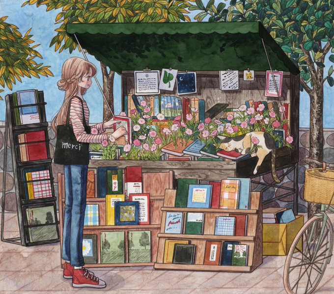 < 책장 너머로 보이는 낯선 달> 📚🌙🐈 2019년에 그렸던 그림을 새로 리메이크 해보았어요 ʕ•ᴥ•ʔ