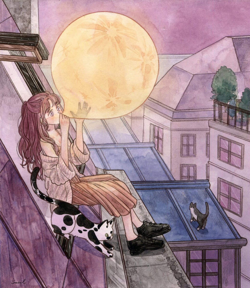 < 숨을 불어 넣은 달 풍선 > 🌕🐈🎈 이번 그림도 리메이크 그림이에요 : )