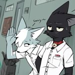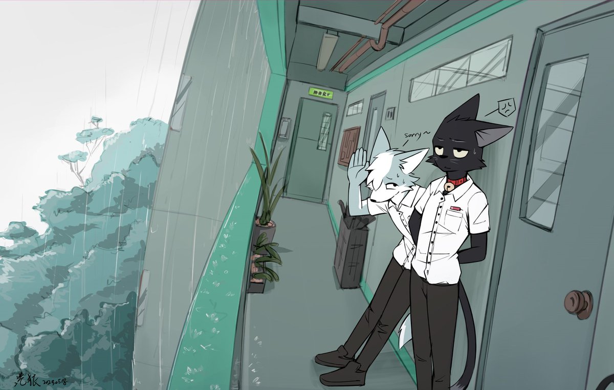 回到學校:罰站 🐱:為何我也要陪你受罪 🐺:抱歉啦~下課請你吃飯