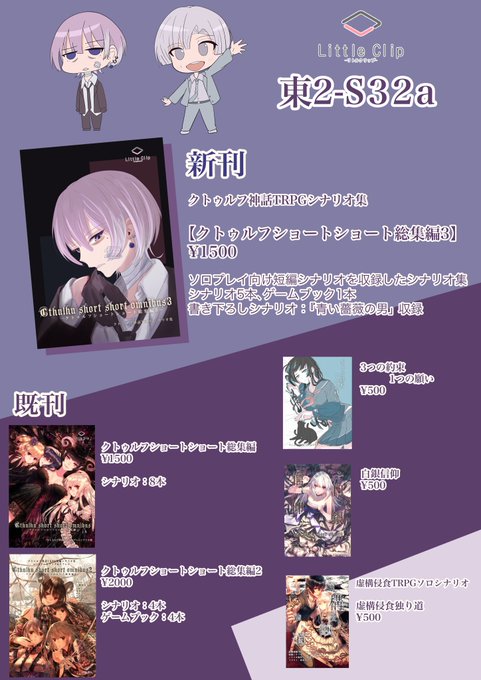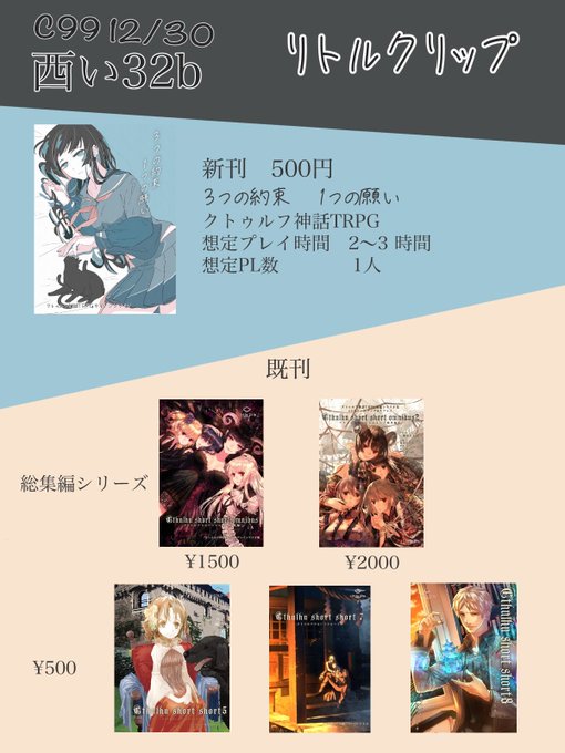 C99お品書き 西い32b リトルクリップです エモみのあるクトゥルフの短編少人数シナリオ揃えております よろしくお願いします! 新刊「3つの約束 1 つの願い」 委託:melonbooks.co.jp/detail/detail.… #C99 #クトゥルフ神話TRPG