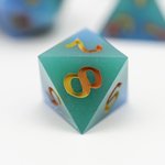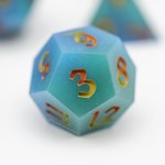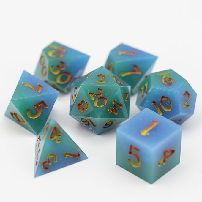 🧡Laguna💙 Inspired by the waters and torchblooms of Rumblecusp from a certain arc of @CriticalRole C2 👀 I’m itching to make EXU and C3 inspired sets, lmk what you’d like to see! #dnd #dice #CriticalRole #handmadedice #CriticalRoleArt #polyhedraldice #fanart