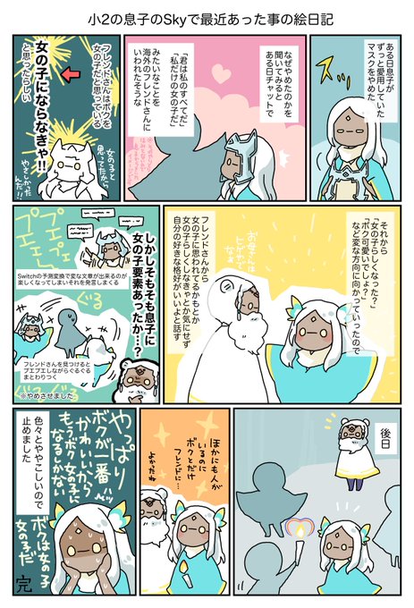 最近のSkyでの息子の様子を絵日記にしました🙈 子どもたちには ネトゲマナーとしちゃダメな事として ・個人情報を出さない ・課金アイテムをフレンドからもらわない 等話してましたが、 今回女の子のフリをしないというのも追加になりました🤔 #thatskygame #sky星を紡ぐ子どもたち #SkyAssemblies