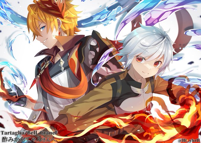 プレゼント用で原神のタルタリヤとダンまちのベル・クラネルを描きました。 喜んでもらえてると良いな。 #絵描きさんと繋がりたい