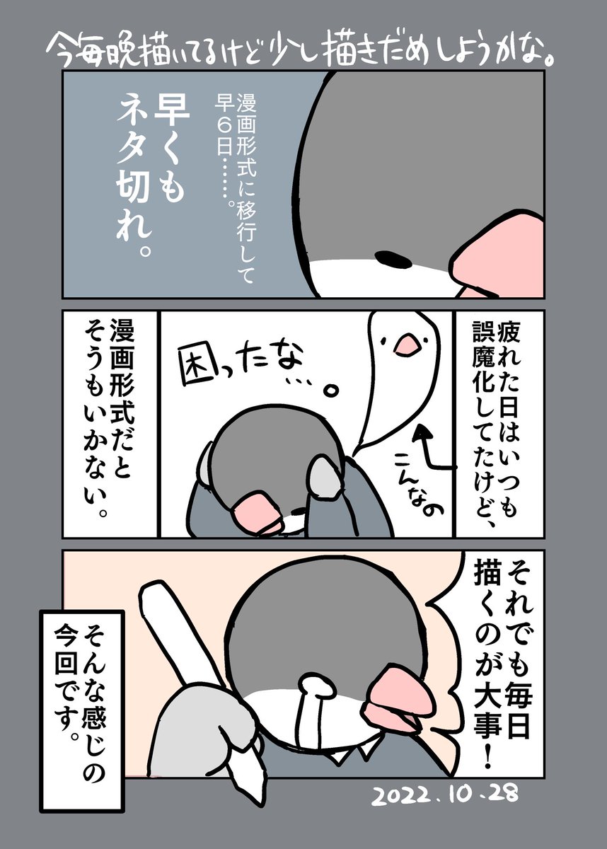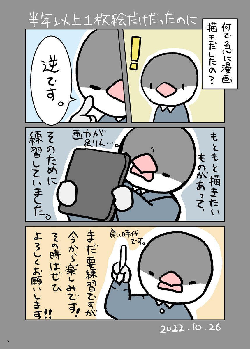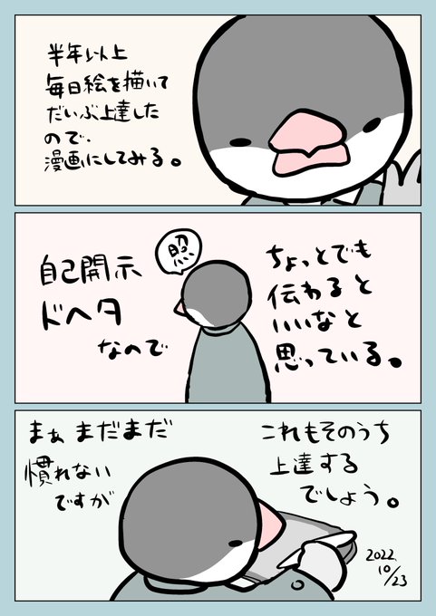 0 3 いつも一枚絵日記でしたが念願の漫画形式に!してみます! 頑張って上達目指すぞー!🕊 #エッセイ漫画 #漫画が読めるハッシュタグ 22/10/24 01:32