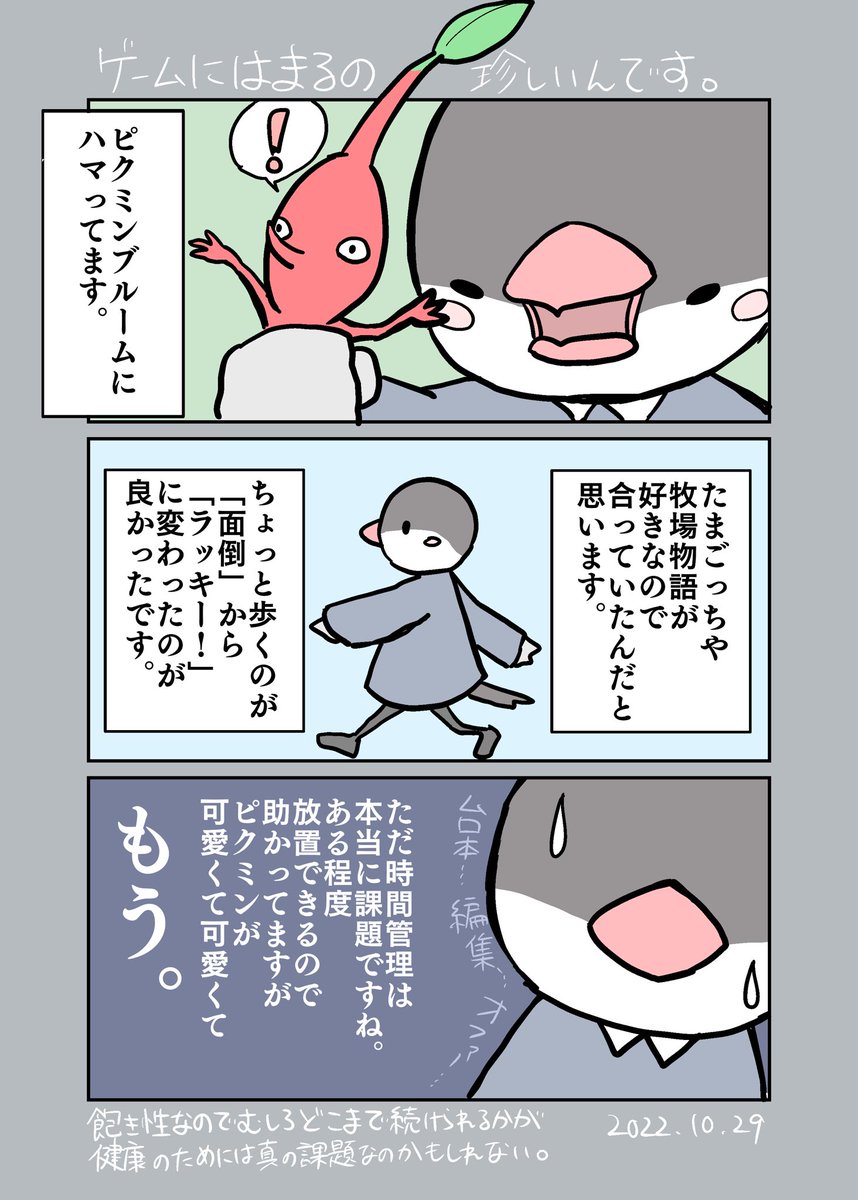 1 5 ピクミンブルームにハマっています。 ハマりすぎないようにも飽きないようにも気をつけつつ、のんびりやっております。 #エッセイ漫画 #漫画が読めるハッシュタグ 22/10/30 00:28