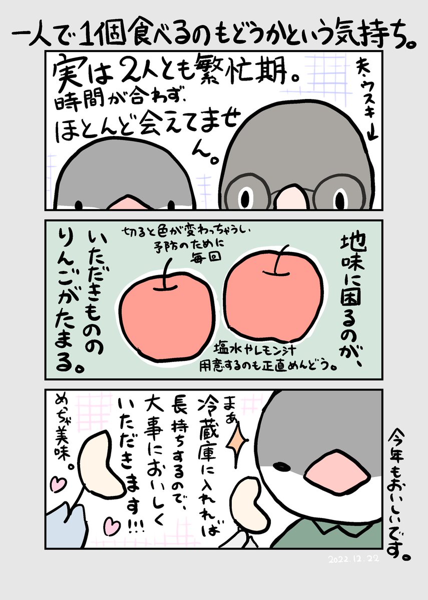 1 0 りんご、大好きです🕊 今冷蔵庫にいただきもののりんご🍎が3つ入っております。年末年始のお休みに食べることになりそうです。 #エッセイ漫画 #漫画が読めるハッシュタグ 22/12/23 10:30