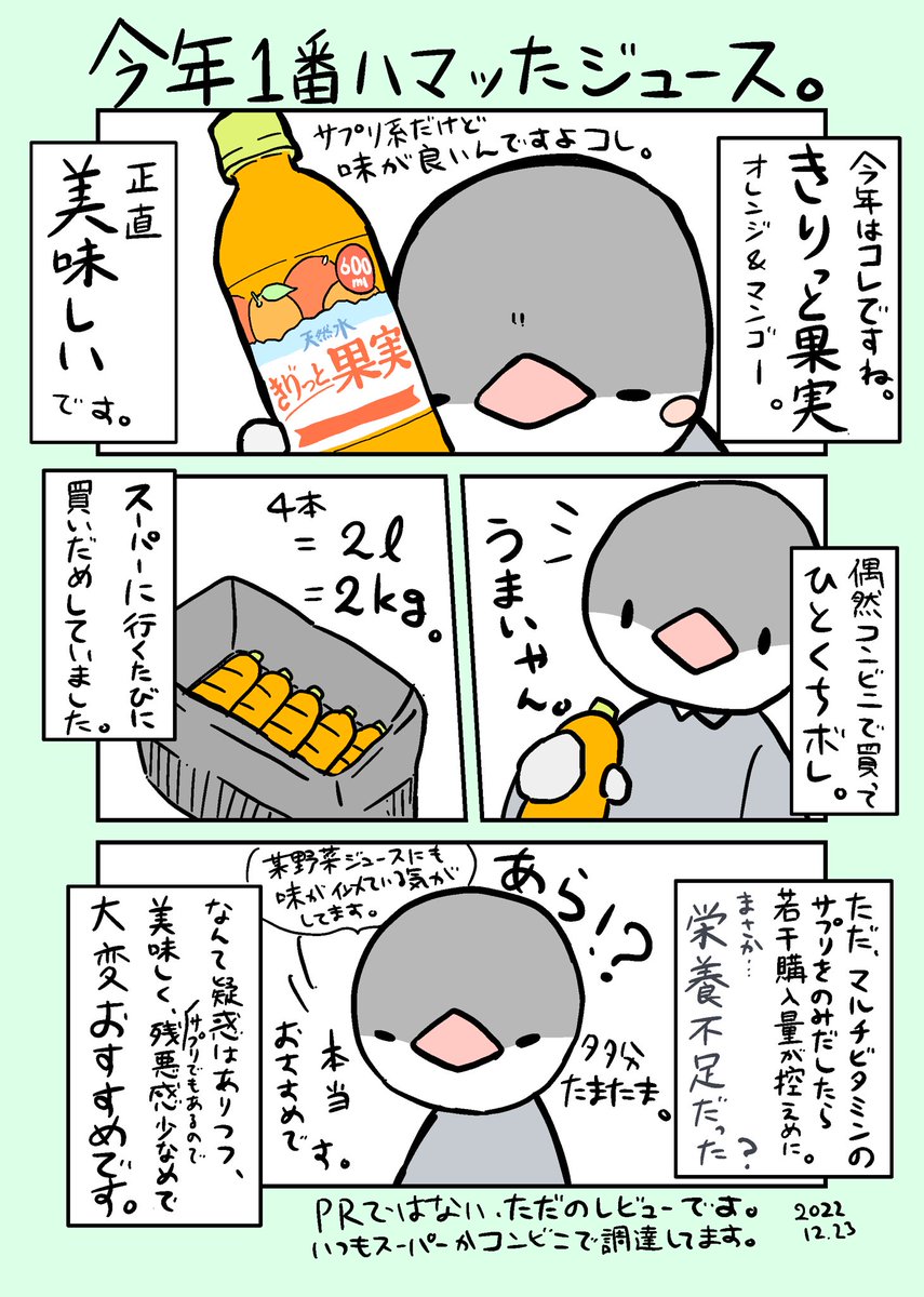 8 16 今年1番ハマったジュースは サントリー天然水 きりっと果実 でした🕊 とにかく味が好きで!少なく見積もっても今年30本は飲んだと思います。 冷やすと特に美味しいです。 おすすめです。 #エッセイ漫画 #漫画が読めるハッシュタグ 22/12/24 01:23