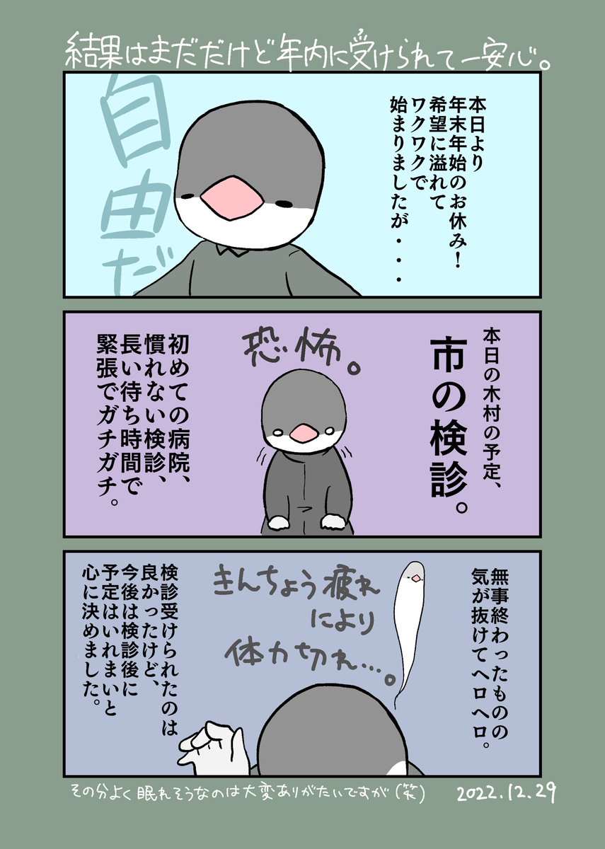 2 2 市の検診。大人になったな!という感じがします。 最近病院で待つ機会が少なかったので、久しぶりの長丁場。モニター表示形式だったので気が抜けなくて参りました。 結果はお医者さんの反応的に多分大丈夫そう!ひとまずは受けられて一安心でした。 #エッセイ漫画 #漫画が読めるハッシュタグ 22/12/30 00:37